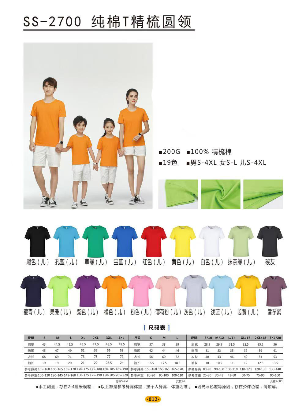 200G亲子款纯棉T恤-短袖17色可选